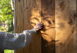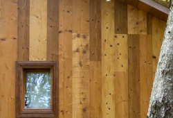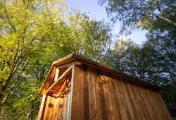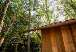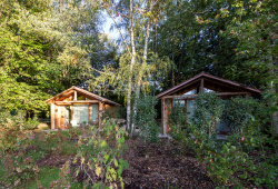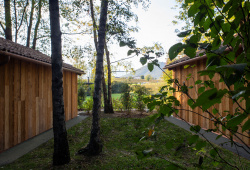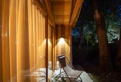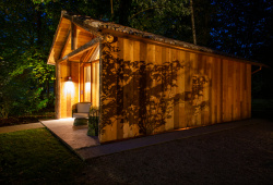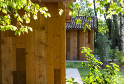 La luce e il vento arrivano piano, tra i rami. Si posano sul legno, scivolano sulle pareti di calce, s’insinuano tra le fibre dell’aria come un ricordo. Ho progettato questi due Lodge per Locanda Sandi, simili a legnaie, non per esistere nel paesaggio, ma con il paesaggio. Perché ogni linea, ogni ombra, ogni pausa potesse appartenere anche al bosco. Li ho pensati come fossero un respiro, un equilibrio fragile ma pieno di vita. Sono luoghi del necessari bisogno di riparo, del bisogno di rallentare, del bisogno di abitare ognuno la propria complessa esistenza. C’è in loro la semplicità che Tessenow cercava: non la povertà del gesto, ma la sua purezza. Non c'è nulla di superfluo: volumi semplici e chiari, proporzioni misurate, un tetto a due falde, il portico che accoglie. Essenziali, inevitabili. Senza retorica, senza esibizione. La bellezza non è nel disegno, ma nel suo equilibrio con la vita. Il legno di recupero racconta di altri luoghi, di mani che lo hanno già toccato. Le vecchie cementine decorate, portano la quiete e la lentezza del tempo. I coppi vecchi appartengono alla legnaia di campagna. Dentro, pochi oggetti. Un letto, tappeti sparsi, silenzio. Fuori, il bosco si muove, l’ombra delle fronde si agita, e l’architettura si muove con lui, Non per imitarlo, ma per ascoltarlo: le case dovrebbero essere come gli alberi: radicate! Ogni cosa qui ha un peso lieve. Ogni cosa vive nella sospensione tra costruito e naturale, tra rifugio e meditazione. Quando cala la sera, il legno si fa ombra e odora di pioggia, le grandi vetrate filtrano la luna che danza sui tappeti. E rimane soltanto il respiro del luogo: quel suono quasi impercettibile che dice che l’architettura, a volte, non serve a costruire, ma a sentire.